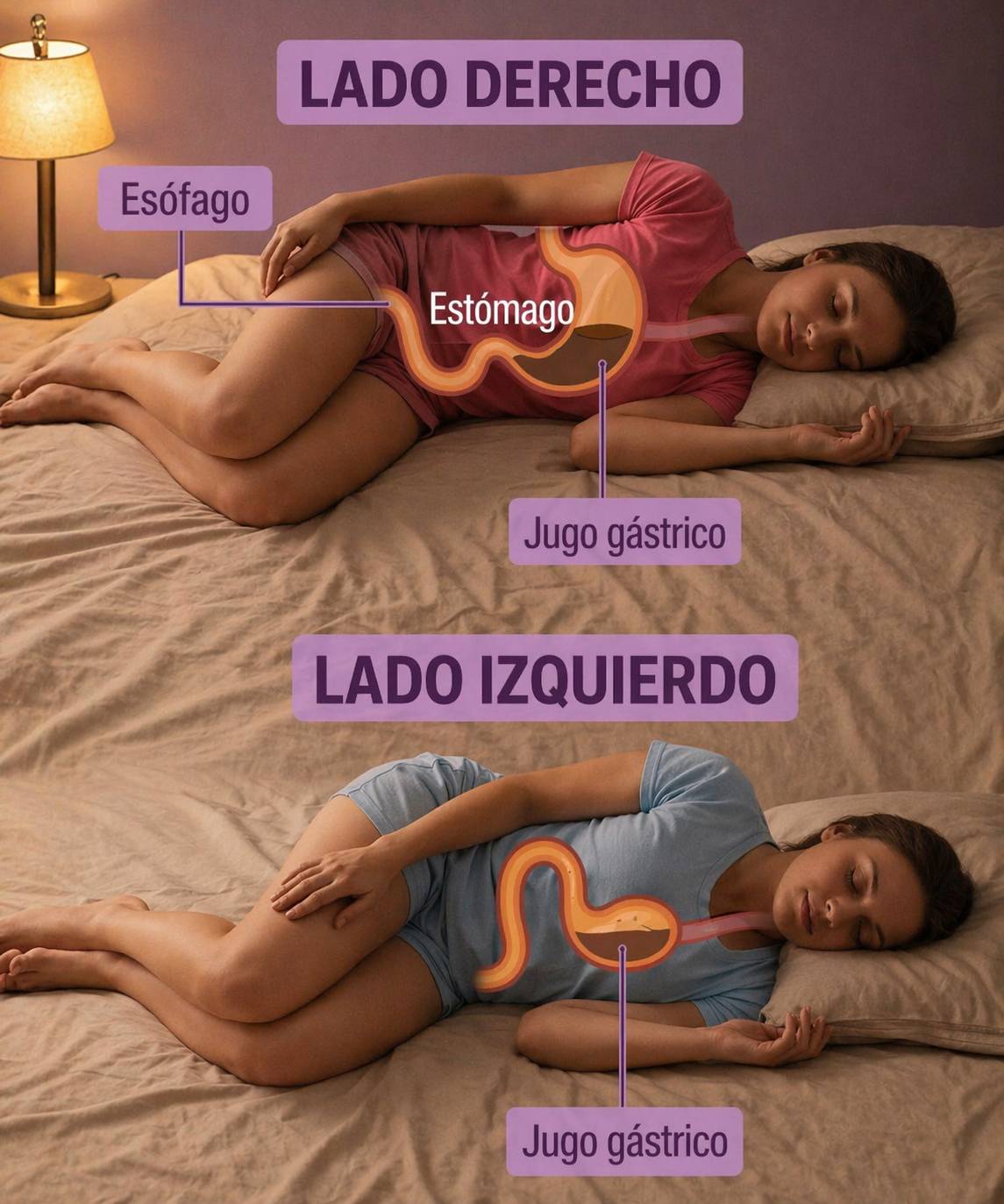 La razón es anatómica: cuando se duerme del lado derecho, la unión entre el estómago y el esófago queda en una posición que favorece el ascenso del ácido. Del lado izquierdo, el estómago queda por debajo del esófago y el reflujo es menos probable.