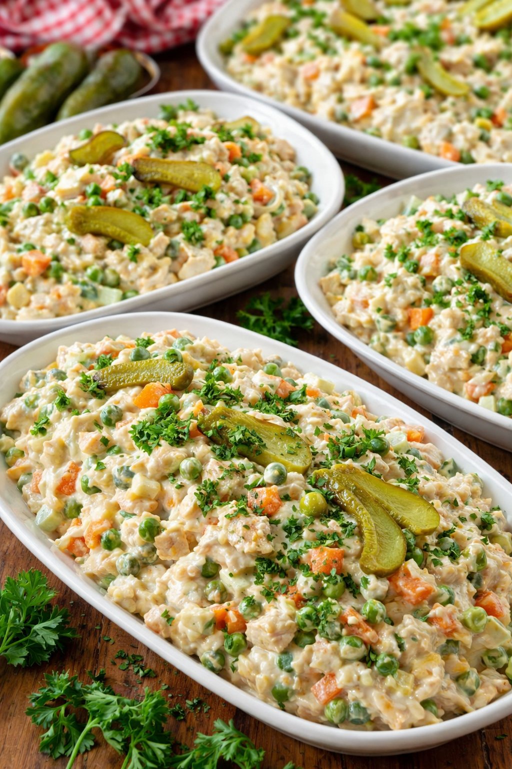 Es una variante muy popular de la ensaladilla rusa, pero con un toque más proteico gracias al pollo.