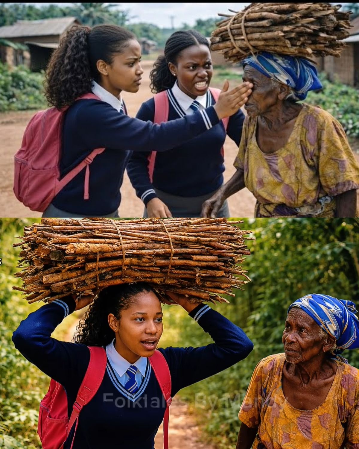 Al llegar al gran árbol Iroko junto a la carretera, vieron a una anciana venir desde la dirección contraria. Estaba muy débil, corbada y temblando, como si sus huesos estuvieran cansados de la vida. Un pesado manojo de leña estaba atado a su cabeza con una cuerda áspera, y sus manos temblaban mientras intentaba equilibrarlo. Sus pies estaban descalzos, su envoltorio viejo y remendado, y el sudor ya le corría por la cara aunque aún era de día.