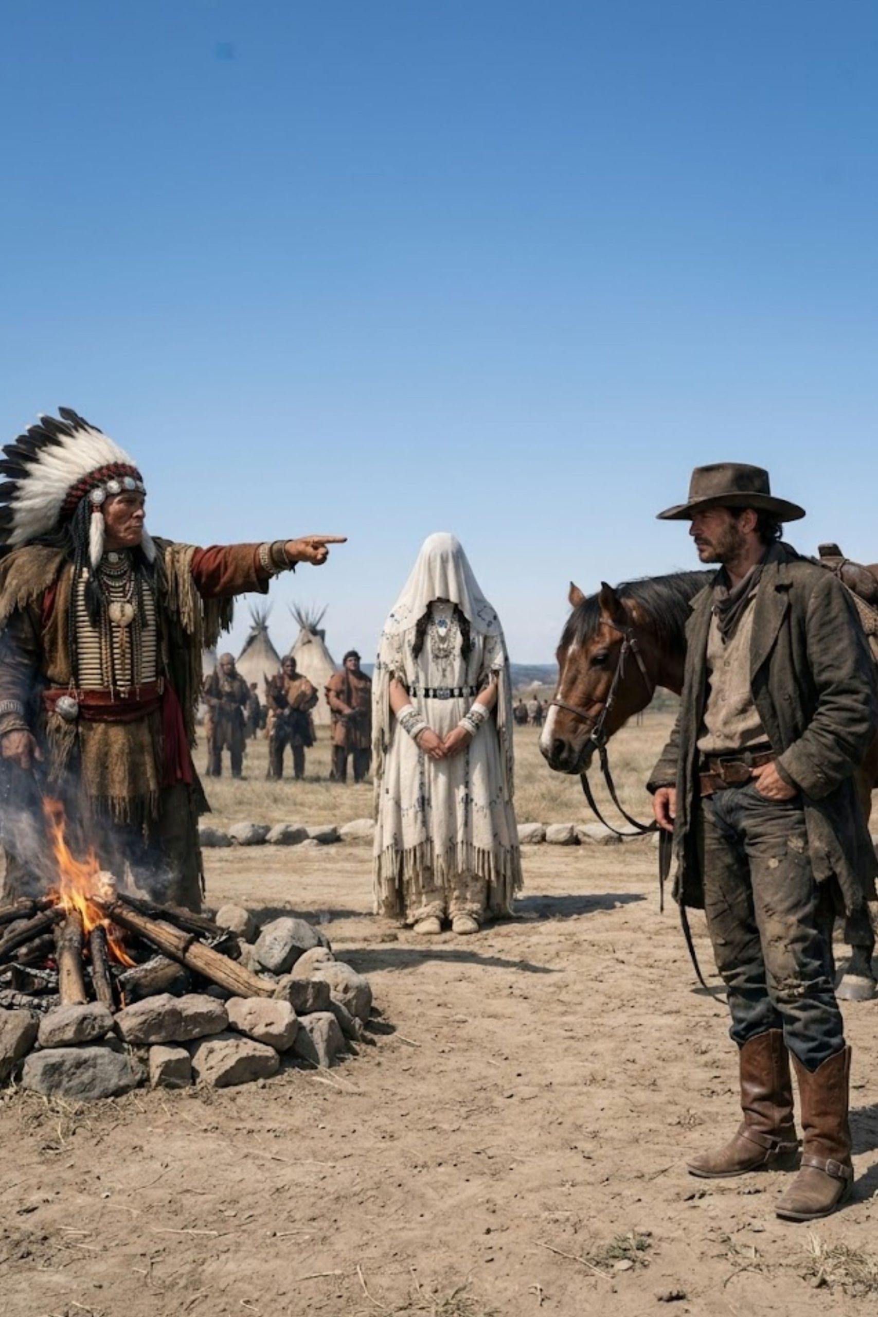 Desde una de las ramadas salió entonces una figura vestida con manta blanca y bordados oscuros. Caminaba despacio, erguida, con el rostro cubierto por un velo ceremonial tan limpio que parecía brillar contra la tierra seca. Nadie se movió. Ni un niño. Ni una anciana. Ni Tomás, que por primera vez perdió un poco la sonrisa.