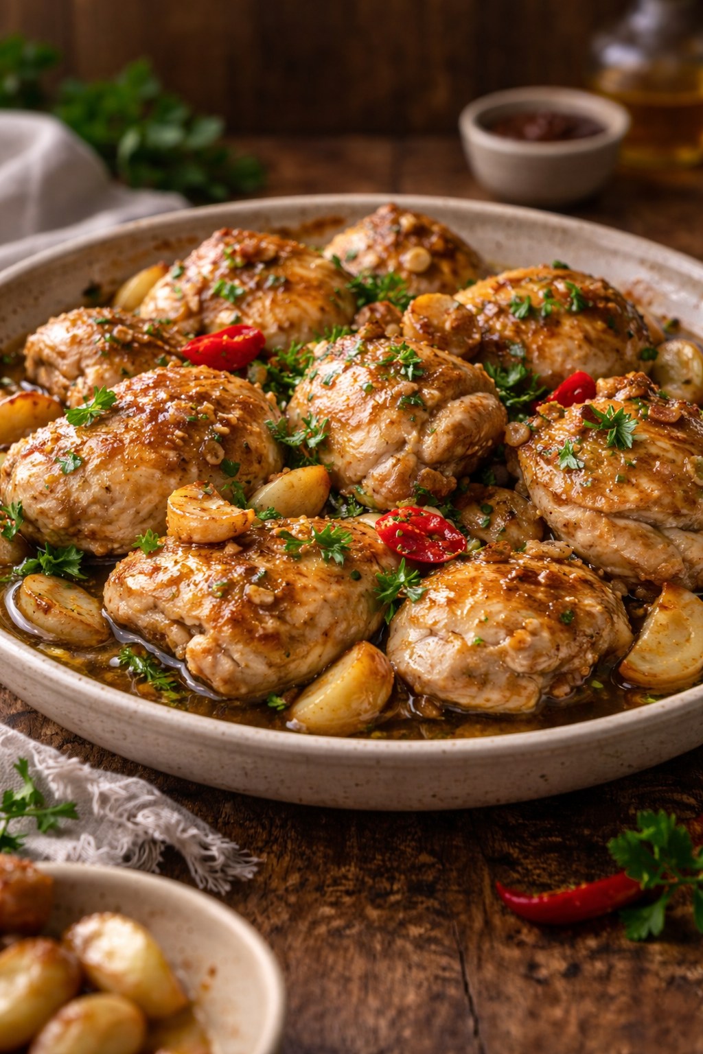 Sirve el pollo bien caliente directamente de la cazuela, napado generosamente con la salsa de ajo. Espolvorea abundante perejil fresco picado por encima y acompaña con gajos de limón para que cada comensal exprima a su gusto. Sirve siempre con pan rústico de miga densa para mojar en la salsa — es la mejor parte del plato.