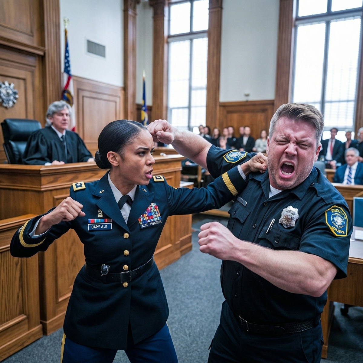 La sargento Chloe Jenkins estaba sentada en la mesa de la defensa con la espalda recta, el uniforme impecable y una calma que no parecía humana. Sus medallas no estaban ahí para adornar el pecho: hablaban de años de servicio, despliegues, disciplina y entrenamiento real. Aun así, esa mañana estaba en un tribunal civil, acusada de resistirse al arresto y alterar el orden.