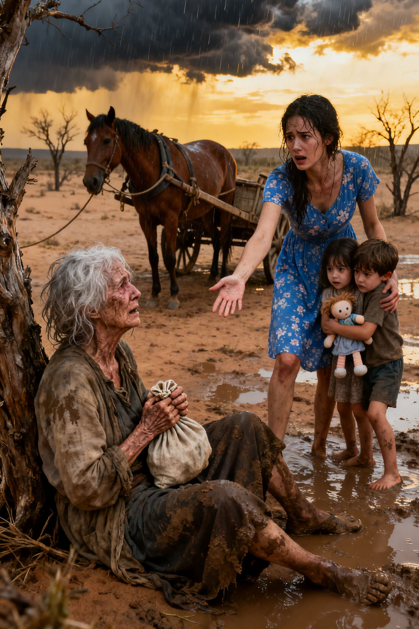 Era una mujer anciana sentada en el lodo con la espalda contra el talud de tierra roja, los pies descalzos azulados de frío, la cabeza caída, el cabello blanco suelto y pegado a la cara por la lluvia y las manos. Remedios. vio las manos antes que nada, unas manos viejas llenas de manchas del tiempo, aferradas a una bolsa de tela pequeña contra el pecho, apretándola con una fuerza que no parecía posible en un cuerpo tan cansado. Se arrodilló en el lodo.